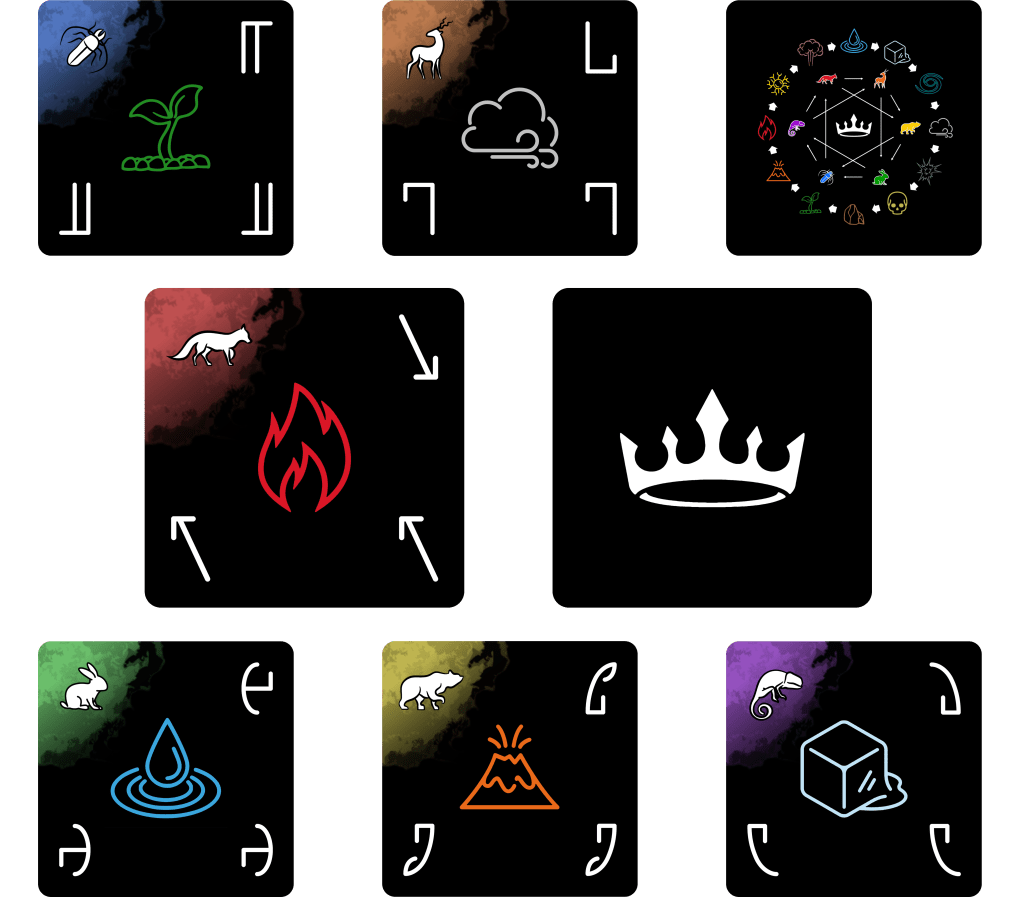 Kings uses an original deck design of 72 cards and is played in a unique fashion. It can be 2-8 players (teams or individual). It is designed to be mostly strategy with some luck mixed in, giving everyone a chance to win! Kings is unique as it is designed to be played from an in-universe perspective.