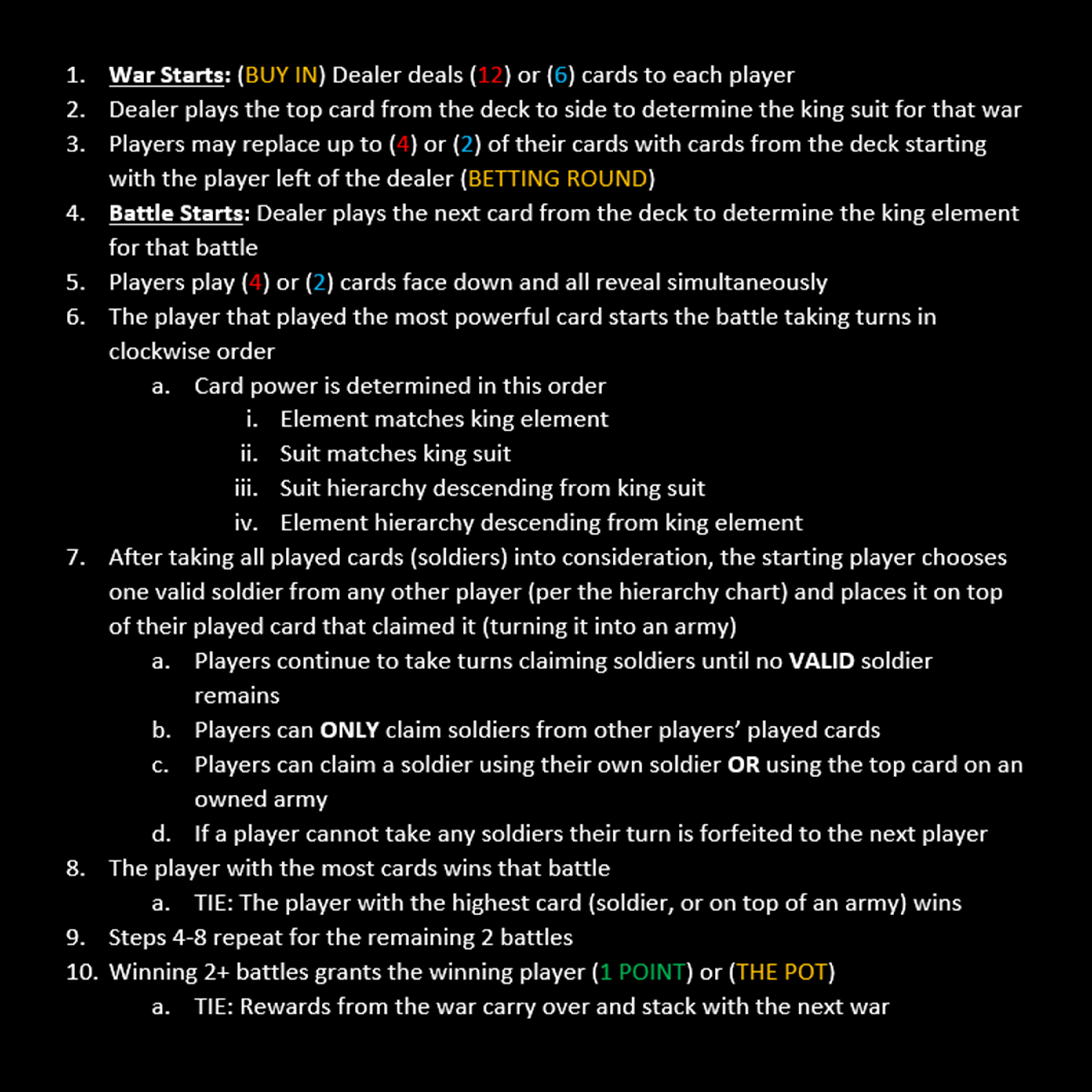 Kings uses an original deck design of 78 cards and is played in a unique fashion. It can be 2-8 players (teams or individual). It is designed to be mostly strategy with some luck mixed in, giving everyone a chance to win! Kings is unique as it is designed to be played from an in-universe perspective.